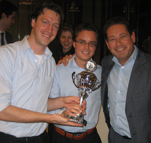 De Cup bleef in het gebouw die avond. Thomas Conijn en Oscar Lamme (beiden De Brauw) mogen zich een vol jaar lang verkneukelen over een glimmend stuk blik. Wordt vervolgd!”